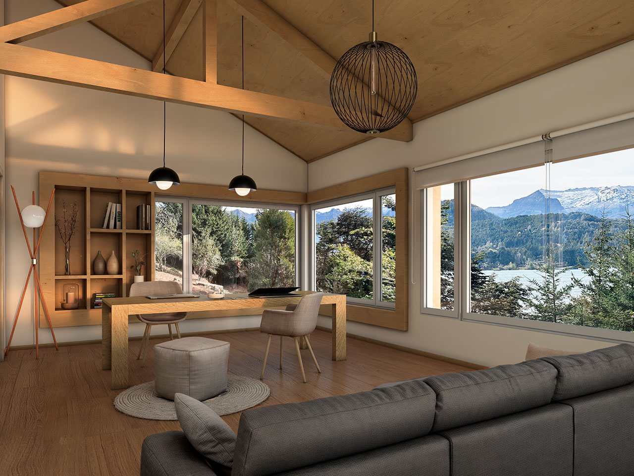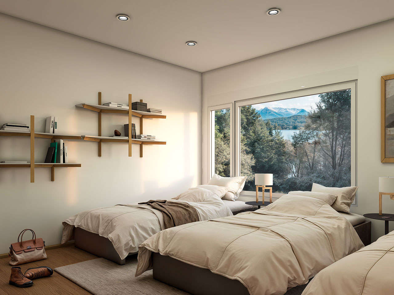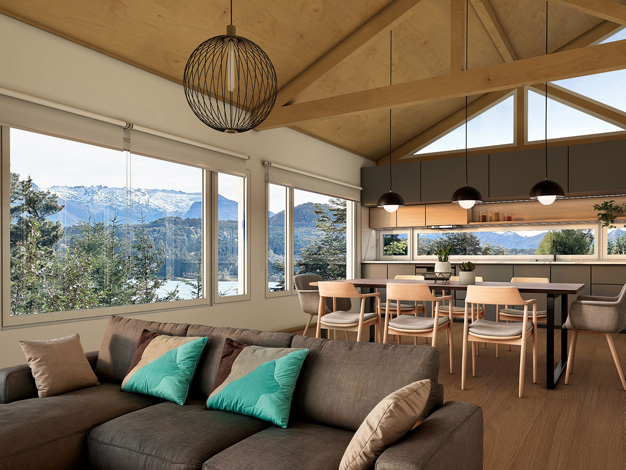 El interior propone un concepto integrado de living, comedor y cocina con vista frontal al Nahuel Huapi, tres dormitorios y tres baños, pensados para disfrutar el micro espacio sin perder conexión con el entorno.